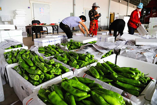 農(nóng)牧民忙著包裝辣椒。李鵬飛 攝