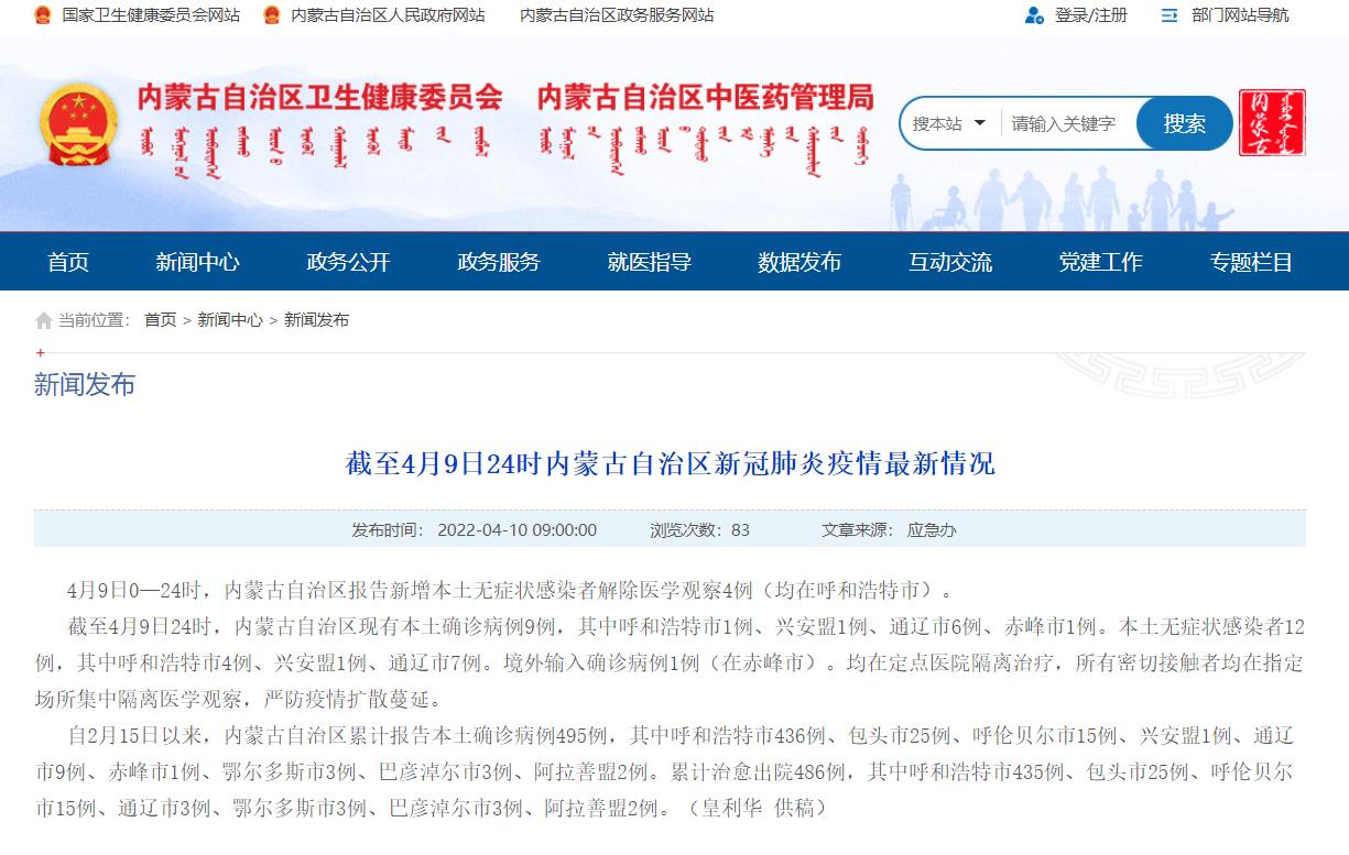 - 人民網(wǎng)呼和浩特4月10日電(趙夢月)4月10日,據(jù)內(nèi)蒙古自治區(qū)衛(wèi)生健康委員會(huì)通報(bào),4月9日0—24時(shí),內(nèi)蒙古自治區(qū)報(bào)告新增本土無癥狀感染者解除醫(yī)學(xué)觀察4例(均在呼和浩特市)。 內(nèi)蒙古自治區(qū)衛(wèi)生健康委員會(huì)網(wǎng)站截圖 截至4月9日24時(shí),內(nèi)蒙古自治區(qū)現(xiàn)有本土確診病例9例,其中呼和浩特市1例、興安盟1例、通遼市6例、赤峰市1例!