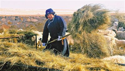 牧民查干在為待產(chǎn)母羊添加飼草。
