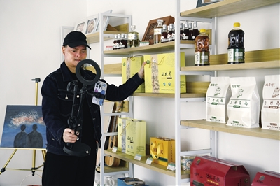 包頭市固陽(yáng)縣金山鎮(zhèn)青年致富能手楊汶興線上銷售當(dāng)?shù)靥厣r(nóng)產(chǎn)品。彭海霞 攝