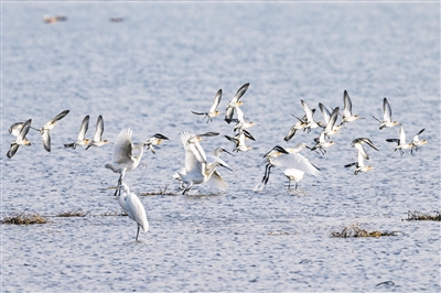 4月8日,在包頭市土右旗民利渠附近的黃河濕地,鵜鶘、鳳頭鸊鷉、白鷺、紅嘴鷗等候鳥覓食游弋,繪就出一幅人與自然和諧共生的壯美畫卷。包頭市位于全球候鳥九大主要遷徙線路之一的通道上,是候鳥遷徙的重要補給站。近年來,隨著黃河濕地生態(tài)環(huán)境的持續(xù)向好,監(jiān)測到的野生鳥類種類和數(shù)量逐年增多。記者 王曉博 攝