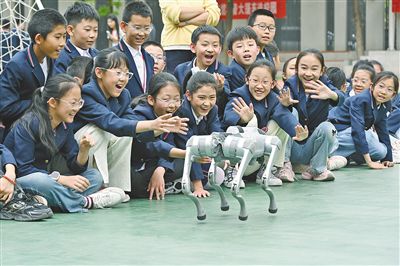 學(xué)生們與機(jī)器狗互動。