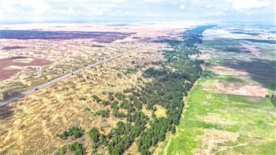 看,風(fēng)起庫(kù)布其,綿延的鎖邊林帶如一條翡翠巨龍,迎風(fēng)而舞、借風(fēng)起勢(shì),守護(hù)著黃河“幾字彎”的青綠安瀾、清波蕩漾。