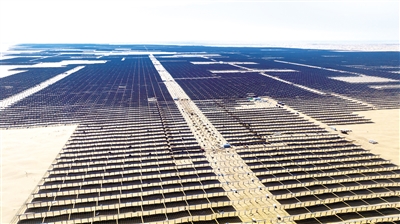 看,光聚庫(kù)布其,400公里的“光伏長(zhǎng)城”圍筑出新能源的盆地,綠電藍(lán)海,正在向世界解讀中國(guó)新時(shí)代防沙治沙的華彩新章。