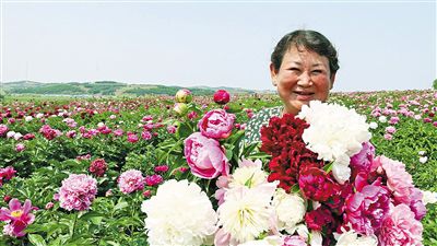 綠野中草藥產(chǎn)銷專業(yè)合作社理事長胡珍珍手捧自己栽培出來的芍藥花笑容滿面。