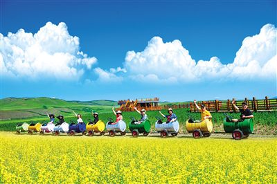7月12日,游客乘坐卡通小火車觀賞油菜花海。記者 李新軍攝