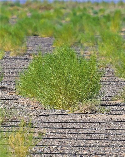 內(nèi)蒙古阿拉善盟西部荒漠綜合治理項(xiàng)目(二期)額濟(jì)納河片區(qū)種植的梭梭樹長(zhǎng)勢(shì)正旺。