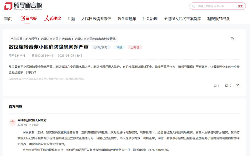 收到留言后,赤峰市敖漢旗人民政府回復,敖漢旗高度重視,立即責成旗消防救援大隊對此進行調查核實。經監(jiān)督檢查人員到現(xiàn)場核實,網友反映情況部分屬實,敖漢旗消防救援大隊已責令景泰苑小區(qū)物業(yè)服務企業(yè)立即改正違法行為,目前已改正完畢,消火栓供水有效,功能正常。同時,要求該小區(qū)物業(yè)服務企業(yè)加強對小區(qū)內消防設施器材的維護保養(yǎng),確保消防設施設備完好有效。