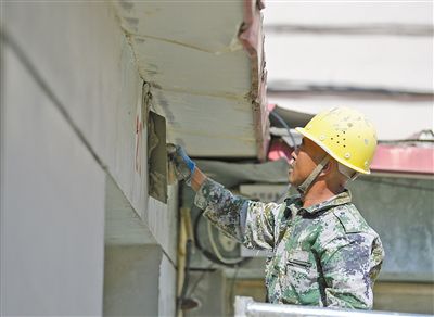 施工人員修復改造小區(qū)內(nèi)墻體。