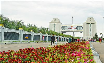 滿洲里國門前花團錦簇,游人往來,盡顯邊境口岸的獨特風貌與蓬勃生機。