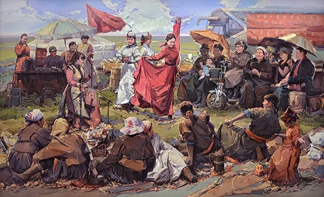 內(nèi)蒙古師范大學(xué)教授張可揚創(chuàng)作的布面油畫《草原上的烏蘭牧騎》。
