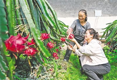 10月3日,在呼和浩特市新城區(qū)萬通路街道塔利村,火龍果種植戶梁淑君(左)正在指導游客采摘火龍果。據(jù)介紹,目前大棚內(nèi)種植的火龍果正陸續(xù)成熟進入采摘期,國慶假期,有不少市民和游客來此品嘗火龍果,體驗采摘樂趣。記者 孟和朝魯 攝