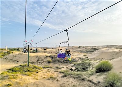 10月7日,游客在鄂爾多斯市達(dá)拉特旗境內(nèi)的銀肯塔拉景區(qū)游玩。銀肯塔拉景區(qū)位于庫(kù)布其沙漠的東端,近年來(lái),當(dāng)?shù)爻掷m(xù)開展治沙綠化工作,累計(jì)治理面積達(dá)1800公頃,筑起一道堅(jiān)固的綠色屏障,生態(tài)“高顏值”正持續(xù)轉(zhuǎn)化為旅游“高價(jià)值”。記者 白雪攝