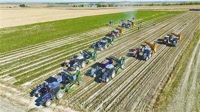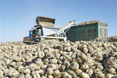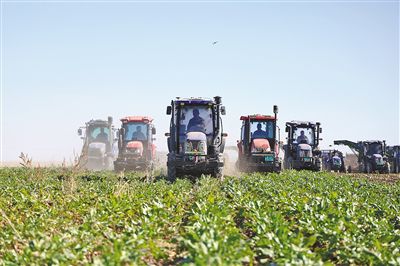 “每天可采收300多畝,預計20天能完成采收,今年畝產(chǎn)約4.5噸?!焙献魃缃?jīng)理高國艷介紹,合作社通過土地集中連片托管模式,充分發(fā)揮資源、技術(shù)、設(shè)備優(yōu)勢,顯著提高了甜菜畝產(chǎn)效益。