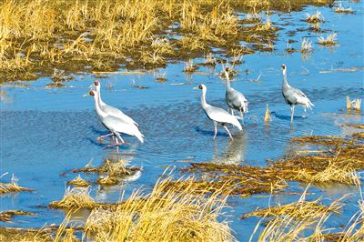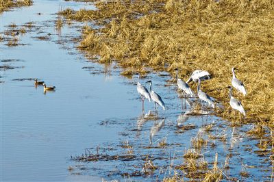 珍稀鶴類在淺灘悠然棲息。