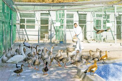 工作人員為保護(hù)區(qū)救助中心內(nèi)的鳥類喂食。