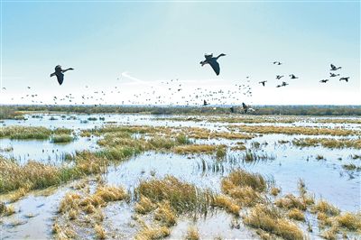 大批候鳥在藍(lán)天與濕地間自由翱翔。