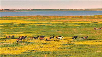 包頭市達(dá)茂旗查干哈達(dá)蘇木成群的蒙古馬馳騁在騰格淖爾湖畔。