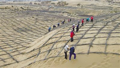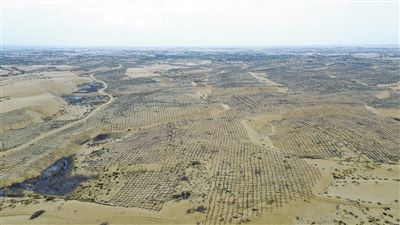 鄂爾多斯市烏審旗境內(nèi)的烏毛素沙地,被密密麻麻的沙障牢牢鎖住。
