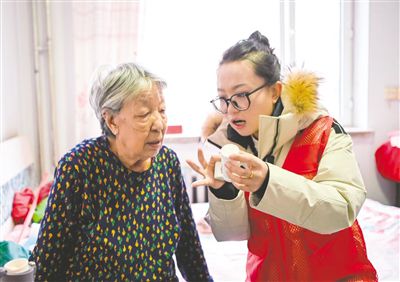 社區(qū)工作人員上門為孤寡老人講解用藥說明。記者 鄭學(xué)良 攝